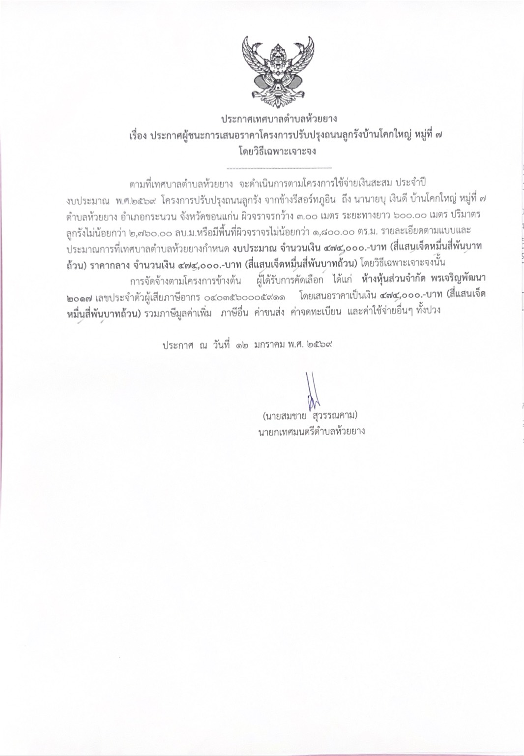 ประกาศเทศบาลตำบลห้วยยาง เรื่อง ประกาศผู้ชนะการเสนอราคาโครงการก่อสร้างถนนคอนกรีตเสริมเหล็ก(เสริมไหล่ทาง) บ้านโคกใหญ่ หมู่ที่7