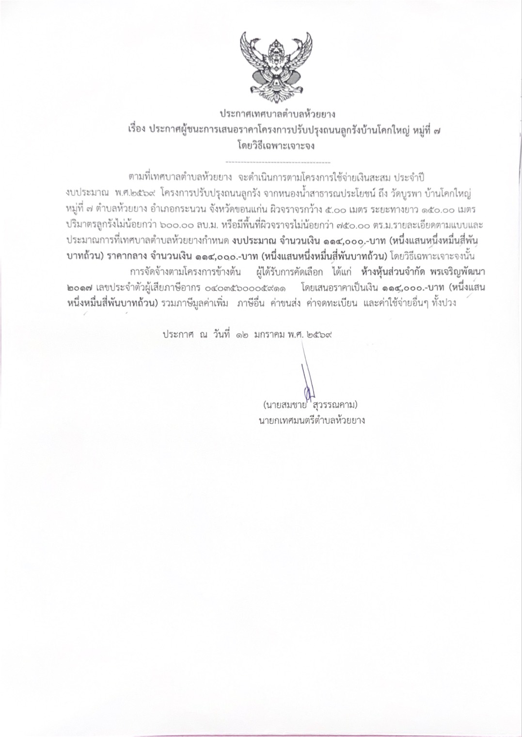 ประกาศเทศบาลตำบลห้วยยาง เรื่อง ประกาศผู้ชนะการเสนอราคาโครงการก่อสร้างถนนคอนกรีตเสริมเหล็ก บ้านโนนสมบูรณ์ หมู่ที่6