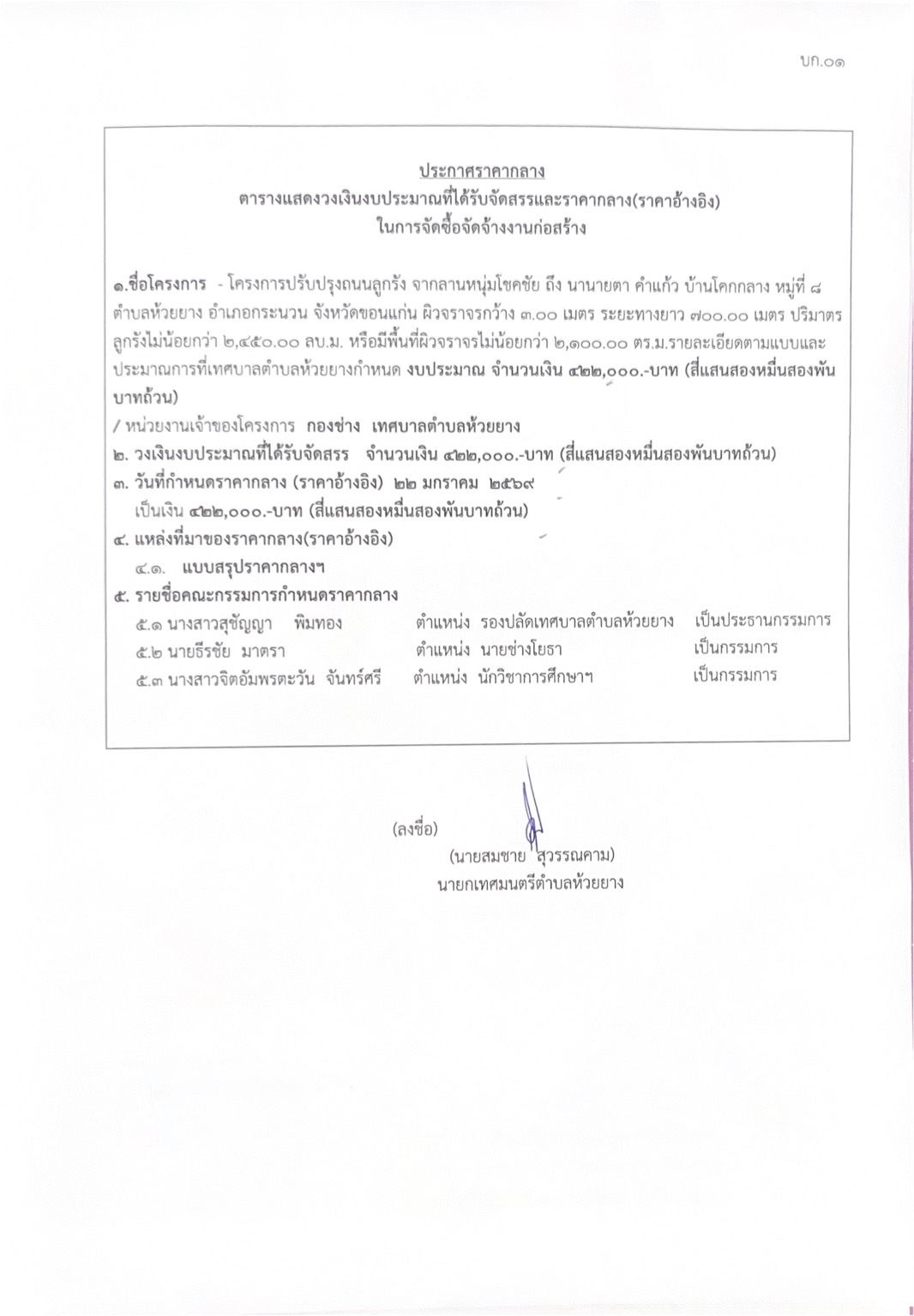 ประกาศเทศบาลตำบลห้วยยาง เรื่อง ประกาศราคากลางโครงการปรับปรุงถนนลูกรัง จากลานหนุ่มโชคชัย ถึง นานายตา