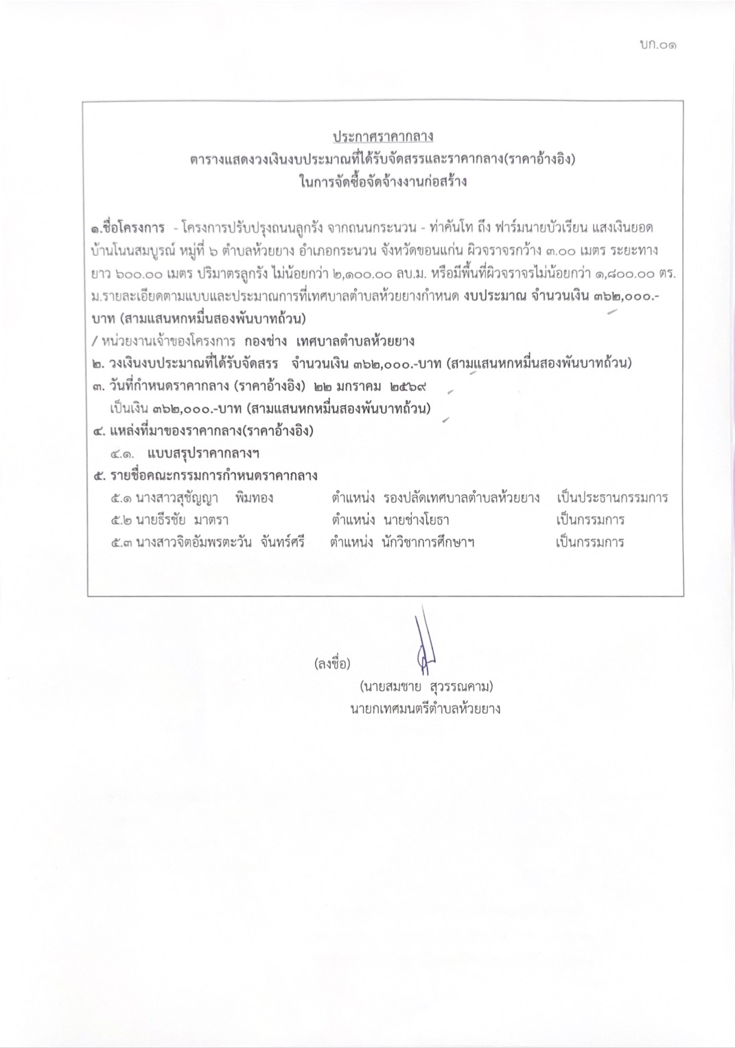 ประกาศเทศบาลตำบลห้วยยาง เรื่อง ประกาศราคากลางโครงการปรับปรุงถนนลูกรัง จากถนนกระนวน - ท่าคันโท ถึง ฟาร์มนายบัวเรียน แสงเงินยอด บ้านโนนสมบูรณ์ หมู่ที่ 6