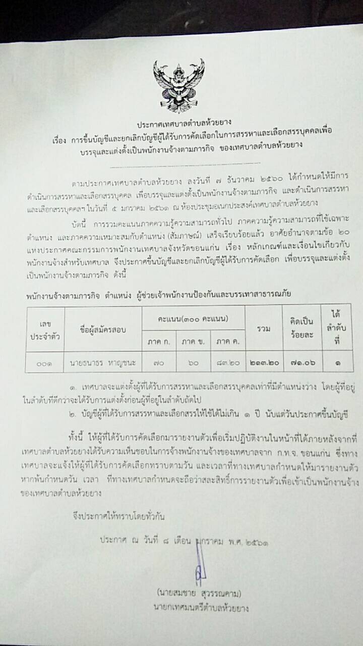 ประกาศการขึ้นบัญชีและยกเลิกบัญชีผู้ได้รับการคัดเลือกในการสรรหาและเลือกสรรบุคคลเพื่อบรรจุและแต่งตั้งเป็นพนักงานจ้างตามภารกิจ ของเทศบาลตำบลห้วยยาง
