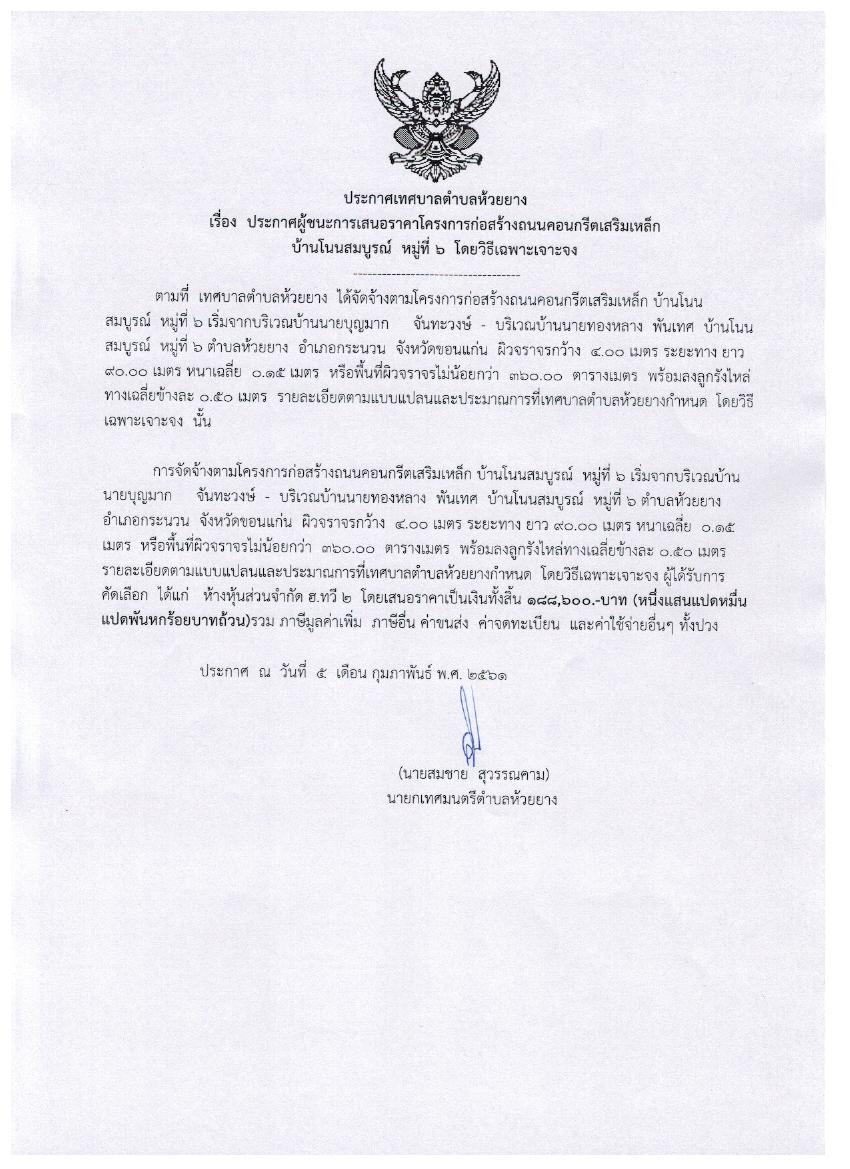 ประกาศเทศบาลตำบลห้วยยาง เรื่อง ประกาศผุ้ชนะการเสนอราคาโครงการปรับปรุงถนนลูกรังบ้านห้วยยาง หมู่ที่ 1