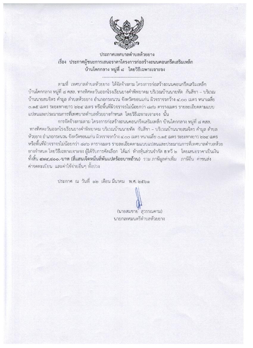 ประกาศรายชื่อผู้ชนะโครงการก่อสร้างถนนคอนกรีตเสริมเหล็ก บ้านโคกกลาง หมู่ที่ ๘ คสล. ทางทิศตะวันออกโรงเรียนยางคำพิทยาคม บริเวณบ้านนายทัด กันสีชา – บริเวณบ้านนายสมจิตร คำมูลลงข่าว: 12/03/2561 โดย : เว็บมาสเตอร์