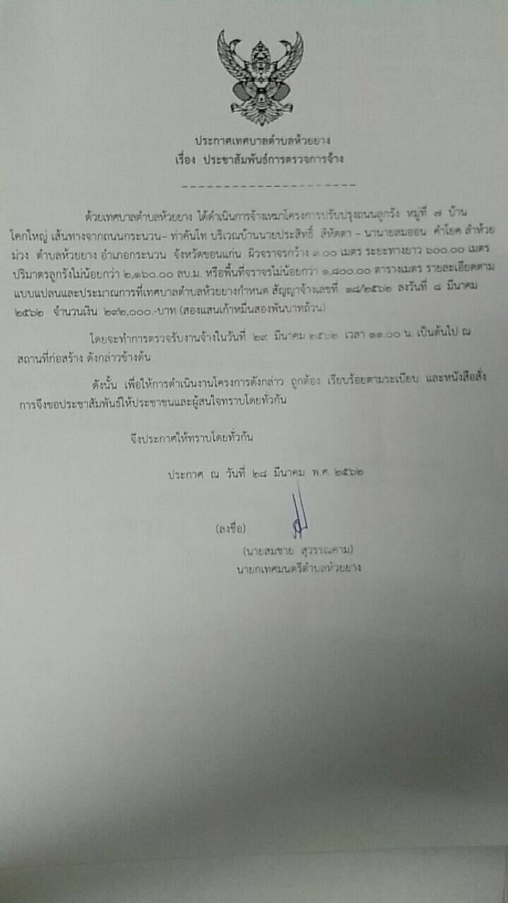 ประกาศเทศบาลตำบลห้วยยาง เรื่อง ประชาสัมพันธ์การตรวจการจ้างโครงการปรับปรุงถนนลูกรัง บ้านโคกสว่าง หมู่ที่4