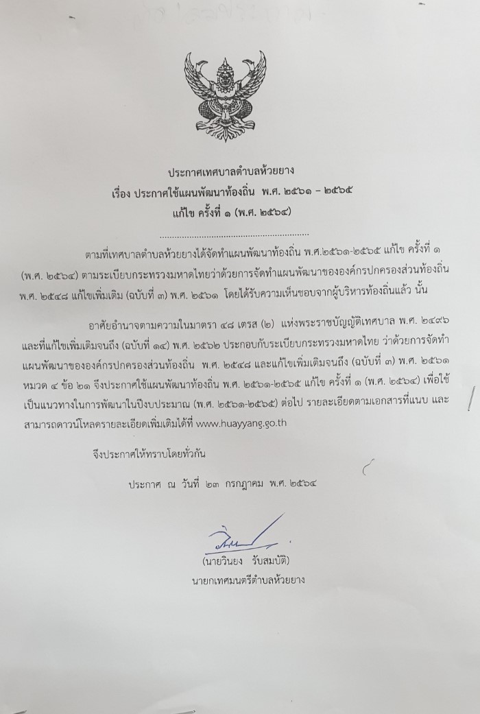 ประกาศ เทศบาลตำบลห้วยยาง อ.กระนวน จ.ขอนแก่น